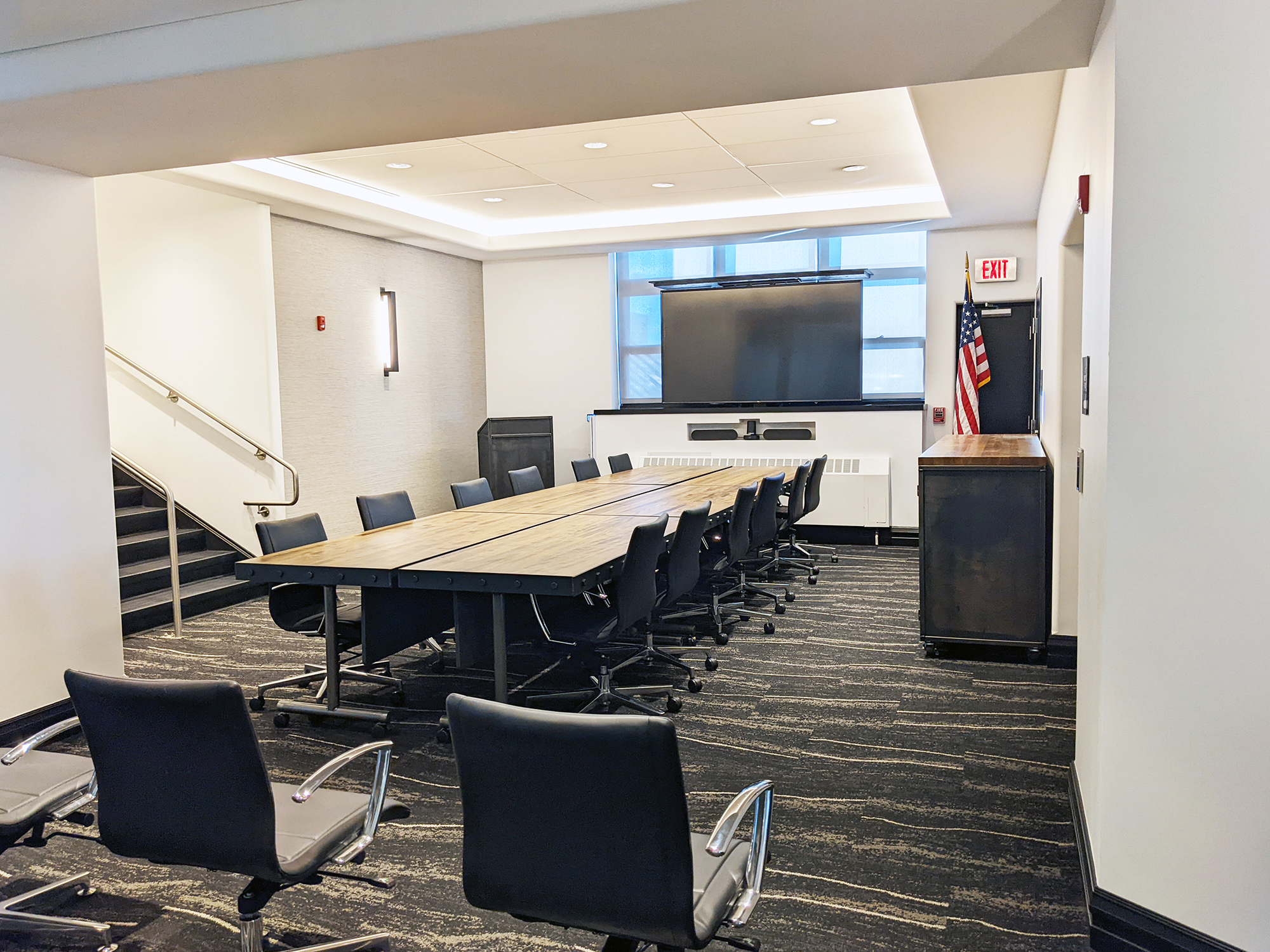 The mezzanine waiting area also received updated finishes, a glass railing, and A/V capabilities. Planning for new administrative offices on the second floor stopped at design development, but the conference center and mezzanine renovations were completed in the Spring of 2022.