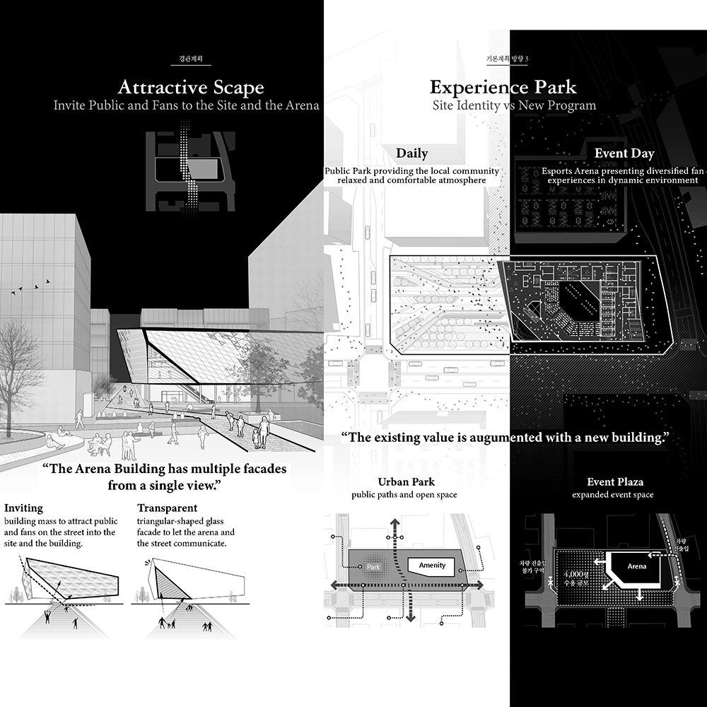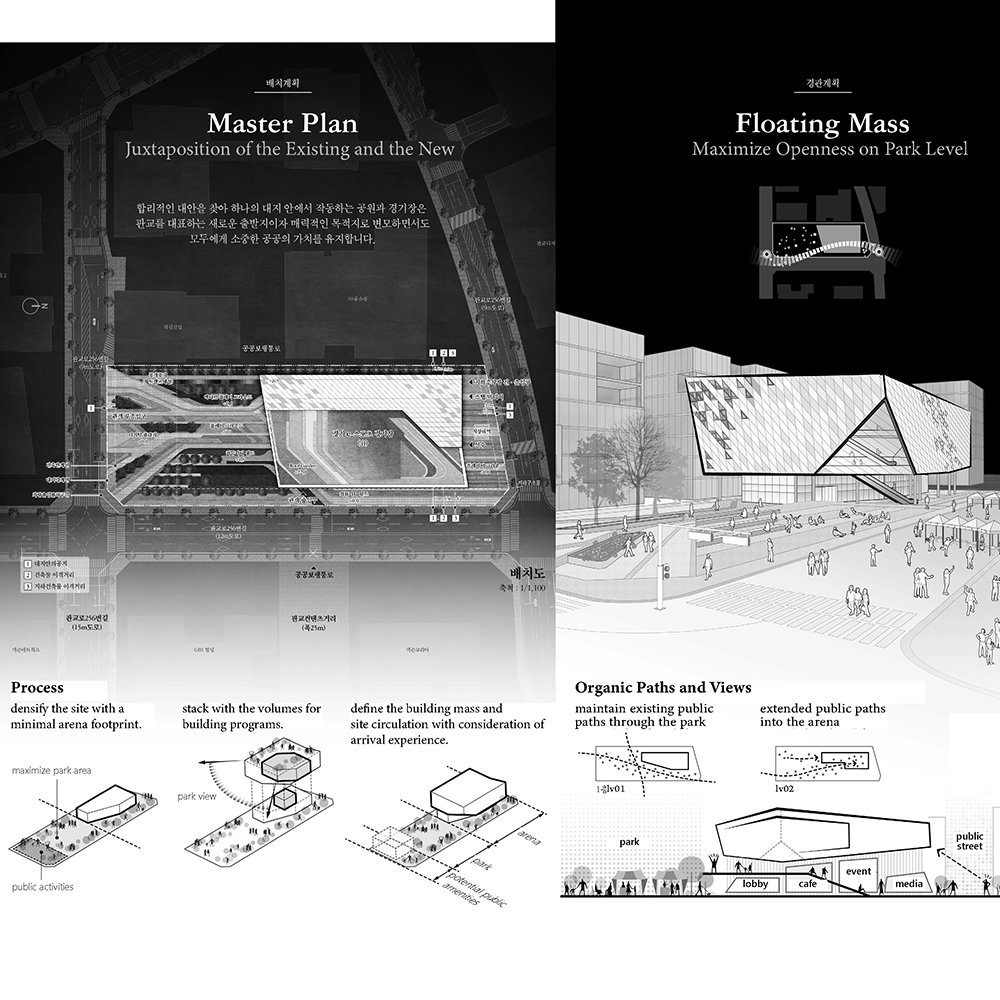 Park Arena, although unbuilt, was designed as a new home for the local Esports community, and to be a sustainable, energy-efficient extension of an existing urban park. The design embraces the identity of the park and the journey of various user groups including fans, performers, operators, and local community members visiting and traveling through the proposed site on both game and non-game days, allowing for flexible use 365 days a year.
