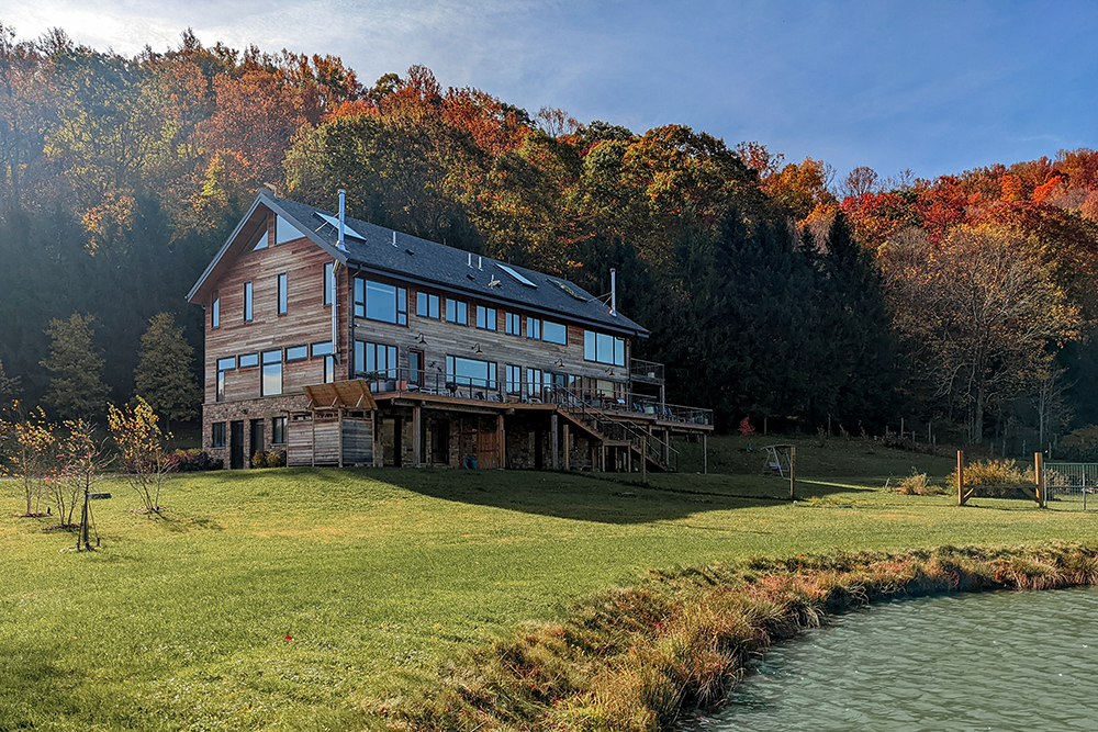 Energy consumption is supplemented by sustainable, cost-effective renewable resources, such as geothermal heating and a ground-mounted PV solar panel array. The design incorporated locally-sourced materials, including stone veneer and heavy timber. The result is a contemporary rustic lake home for the entire extended family to enjoy views of the beautiful Laurel Highlands.