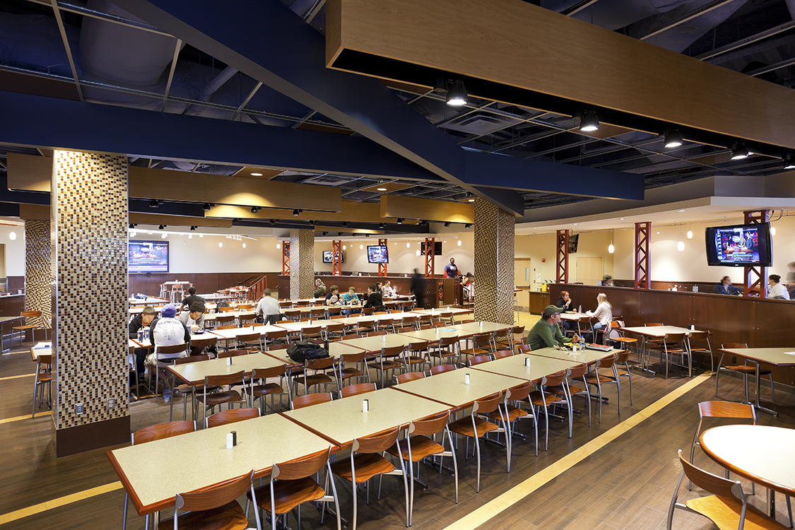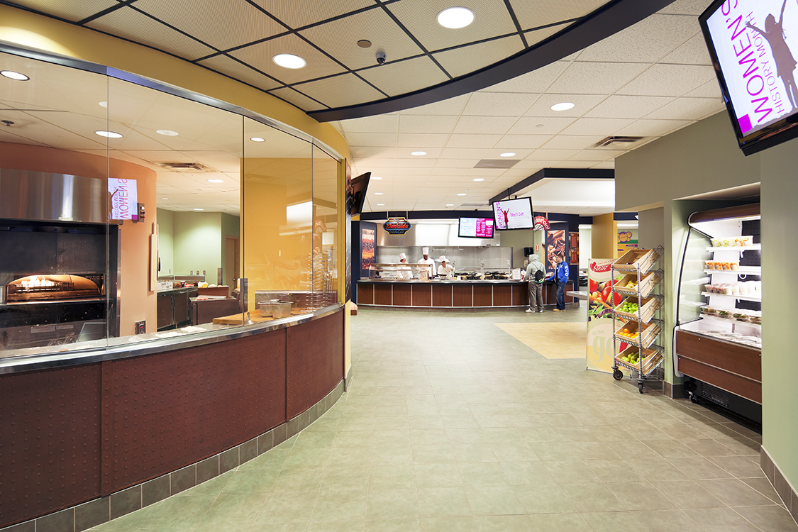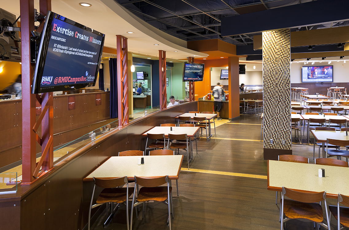Interior renovation to the existing 7,000 square foot Dining Hall and 4,500 square foot servery area at the Nicholson Center at Robert Morris University. DLA+ was responsible for producing construction documents, seating layouts, interior finish and furniture selection and lighting design. The new dining area includes a centralized elliptical shaped dining area, surrounded with elevated platforms that offer a variety of seating types. LCD televisions are positioned throughout the space to allow for views from all seating areas. The finish palette includes a combination of warm jewel tones and rich wood finishes.