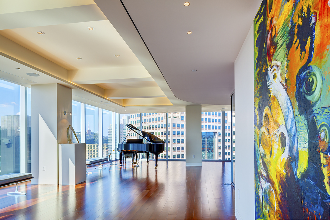 The unit as art and an art display. Very early in the design process it became clear that not only would the unit be housing great art and wine, the space itself would be a work of art. Throughout the unit its remarkable lines, custom features and attention to detail make a clear statement to the beauty of the space. The Fireside Entry Lounge features a dynamic custom curved fireplace unit with art shelving that mimics the curve of the oval ceiling soffit. In the center of the soffit a 30” diameter crystal chandelier hangs to define and ground the seating area. Behind the entry lounge a curved art wall features curved custom artwork frame that continues to translate the oval soffit. Beyond this lounge, the Music Hall and Steinway baby grand featuring lighting that illuminates the piano like a piece of art, create an almost “stage” like setting with Fifth Avenue Place as the backdrop.