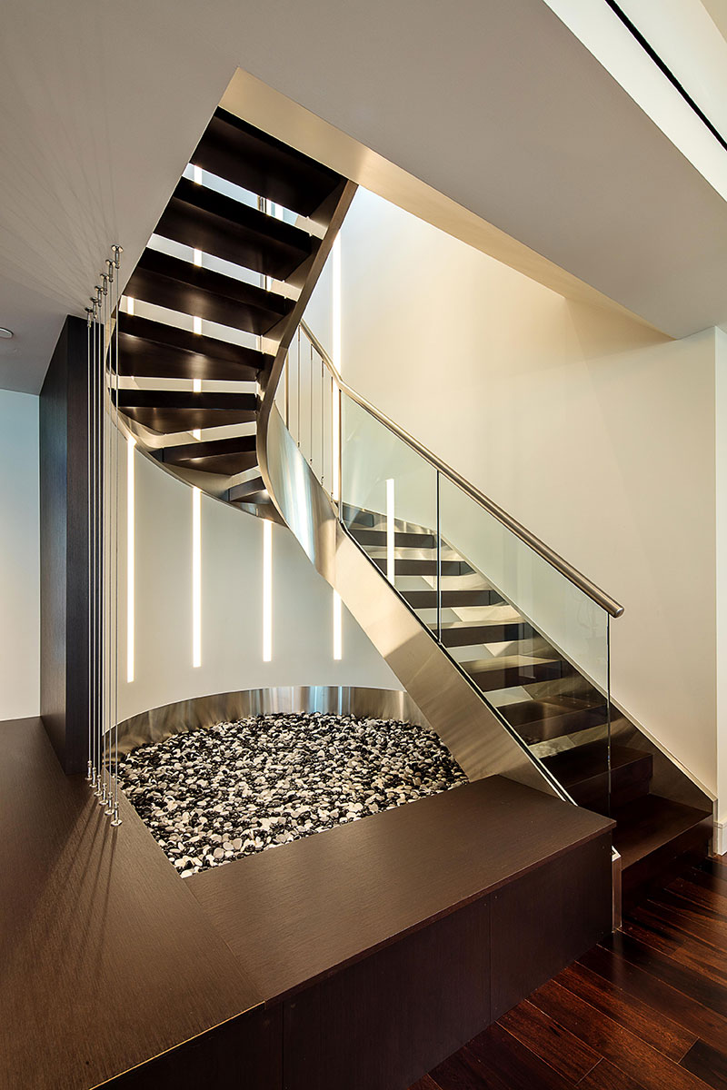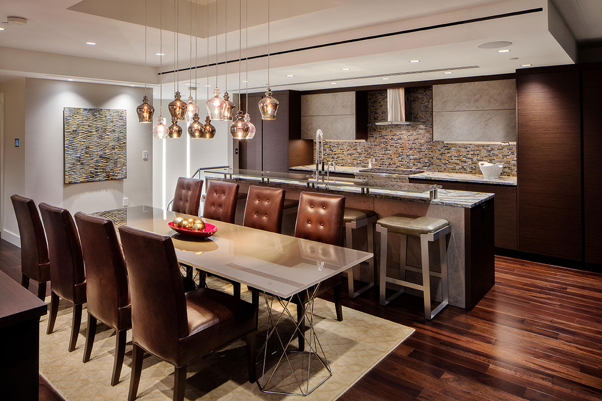 The project started with a design for the owners’ newly acquired unit located below their current condo. This space was designed to provide the growing couple with a space to entertain with bar, billiards and gathering area, wine room and a small media space. As the project evolved, the owner asked DLA+ to renovate their existing condo unit above. These newly combined stacked units would be accessible via a custom curved stairway between the spaces. The renovation included the owners’ more private areas of their kitchen, two bedrooms and bathrooms. In the end, the family now had space that provided the opportunity for hosting and entertaining when necessary but areas for privacy needed by a family with small children.