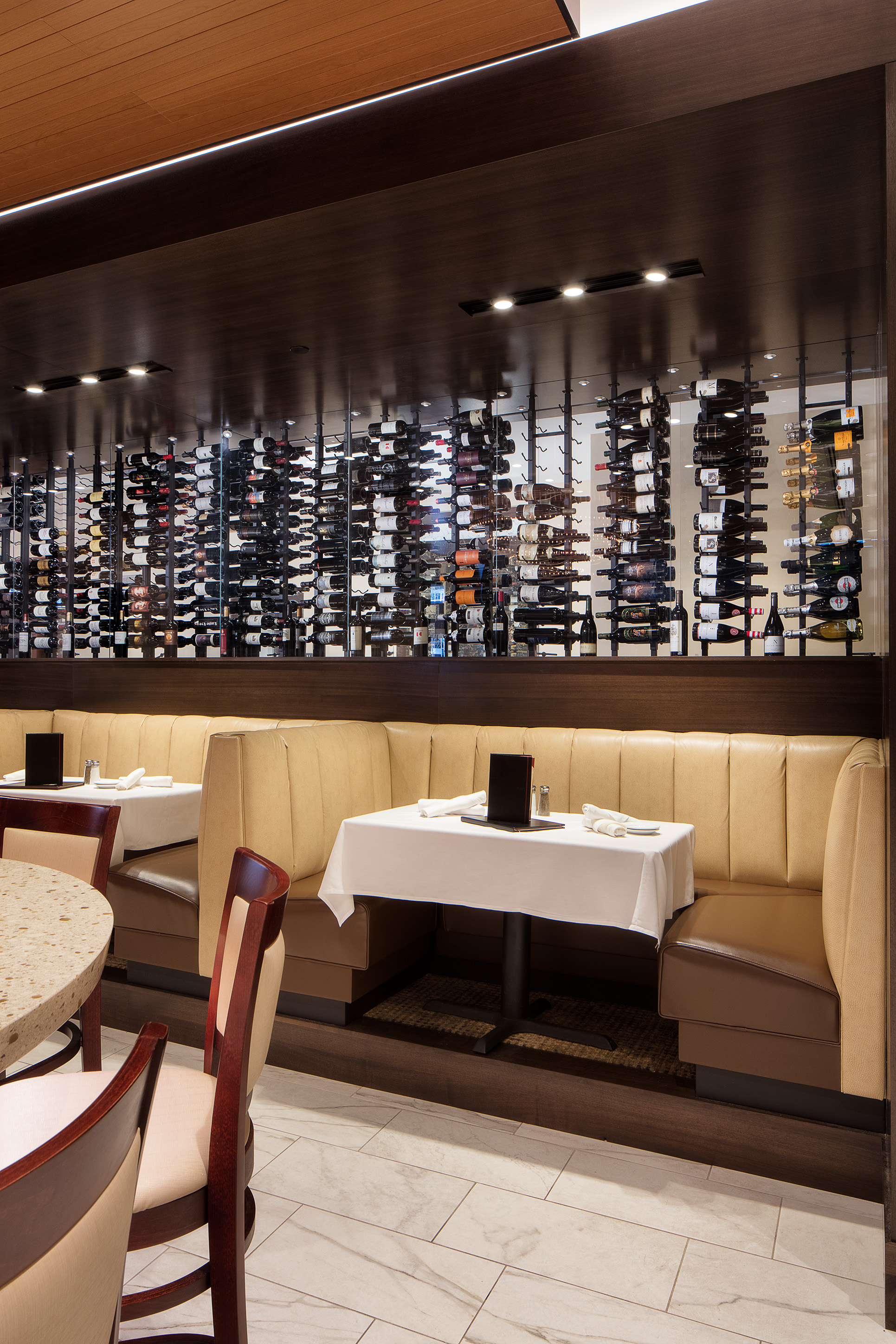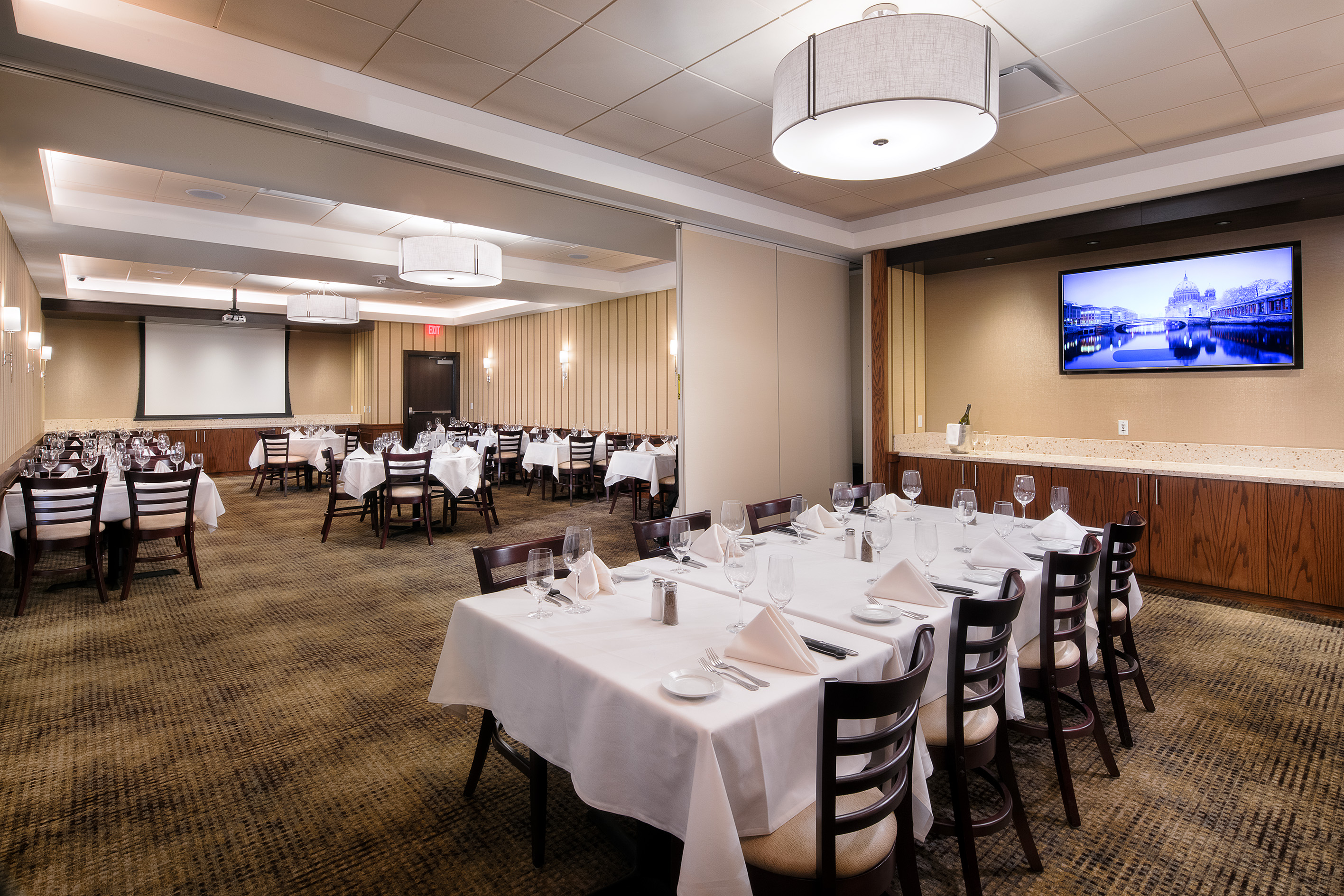 The completed restaurant accomplishes the goals of expansion, including expanding and updating the kitchen and accommodating an enlarged bar and dining area resulting in 284 table seating, 20 booth seating and 30 barstools. Two distinct sized banquet rooms, one with seating for 24 and the other with seating for 32, are separated by a retracting operable acoustic wall. Both are equipped with technology to ensure multipurpose use. The expanded dining area features a new operable window wall that opens it to an exterior plaza dining space with seating for 32, providing views to PPG Plaza fountain.