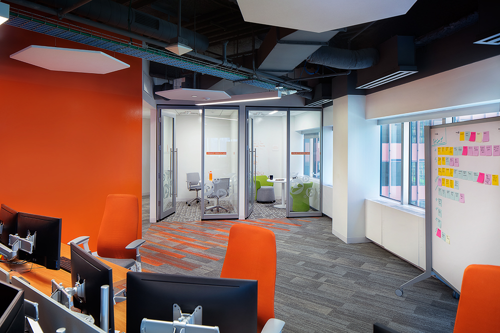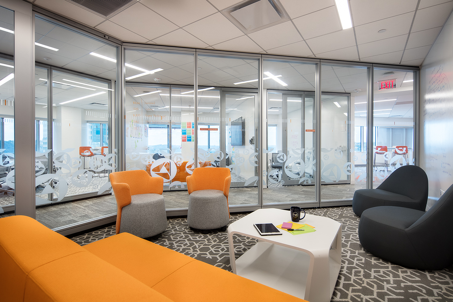 The Innovation Hub includes war rooms, collaborative spaces, development and testing spaces, quiet zones, and team specific neighborhoods. Large group collaboration areas have moveable furniture and white boards to fit the task at hand. The open agile development space are collaborative areas with desks, seating, and whiteboards where teams can brainstorm and develop prototypes. Usability testing rooms are outfitted in one-way glass and video equipment for observation. There is also a common area with a kitchenette and private phone rooms for employees.