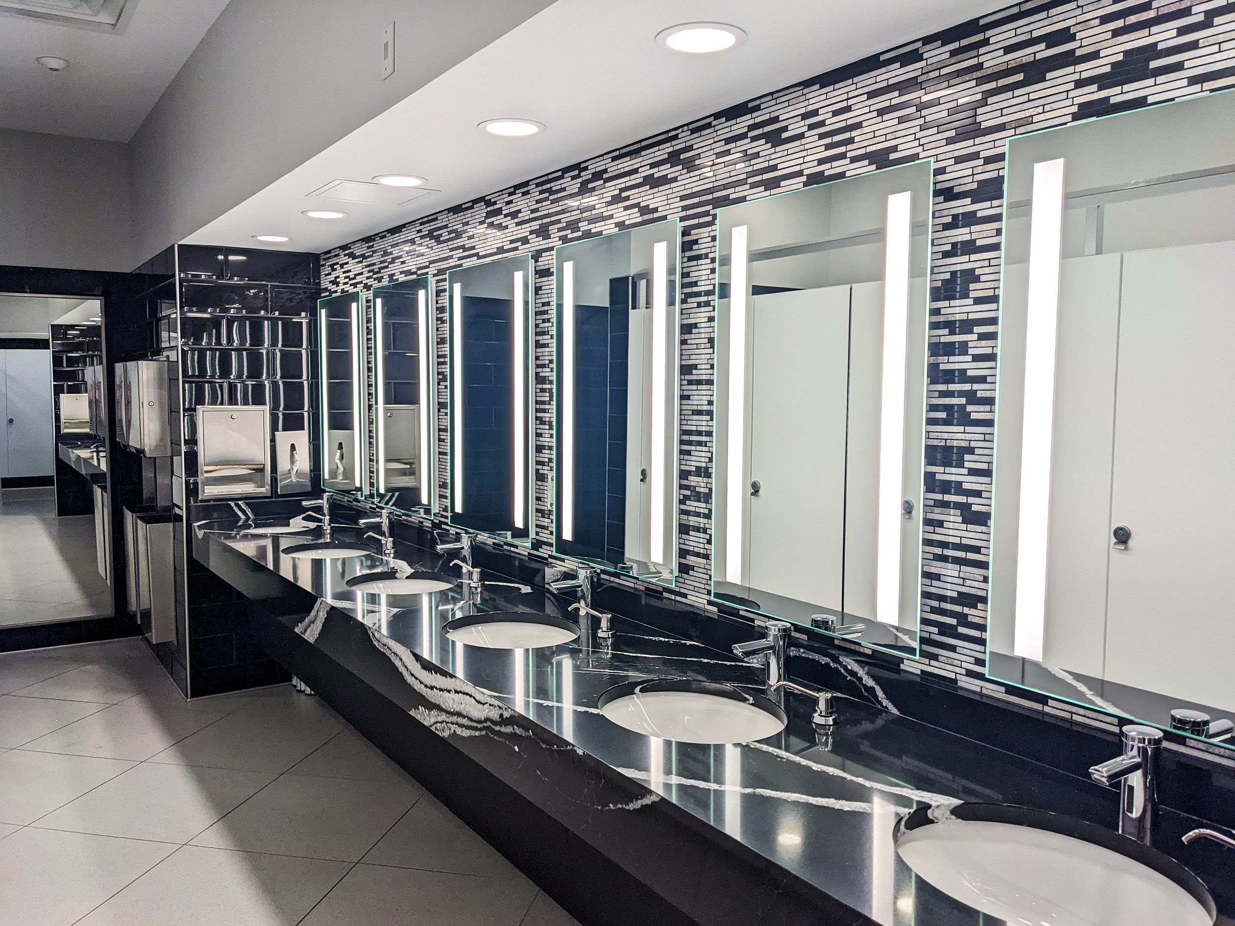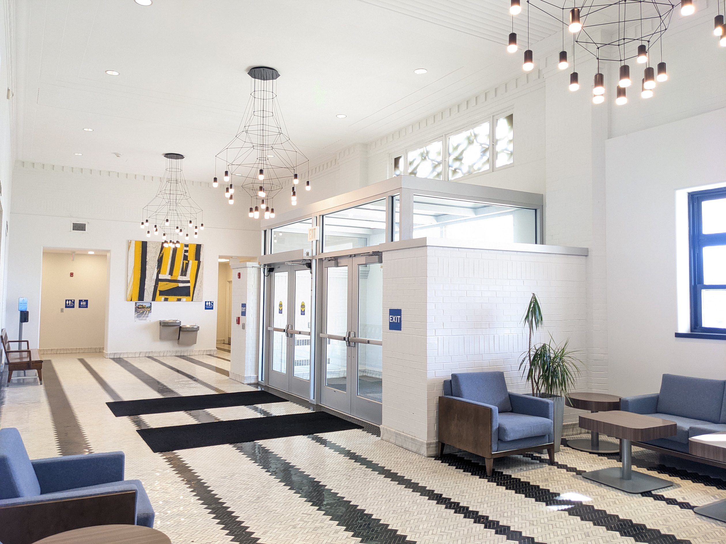 First floor renovations included upgrades and renovations for a new entry vestibule, lobby, transformation of an existing administrative space into a multi-purpose conference facility, and upgrading restrooms to meet the building’s planned occupancy. The historic herringbone tiles were repaired, and new flooring was designed to match the original, preserving the Art Deco design, while contemporary art and light fixtures were incorporated to lend a modern touch. A/V upgrades were included throughout as well.
