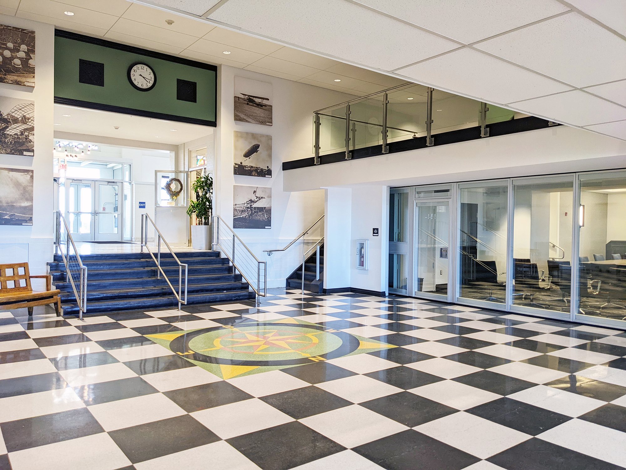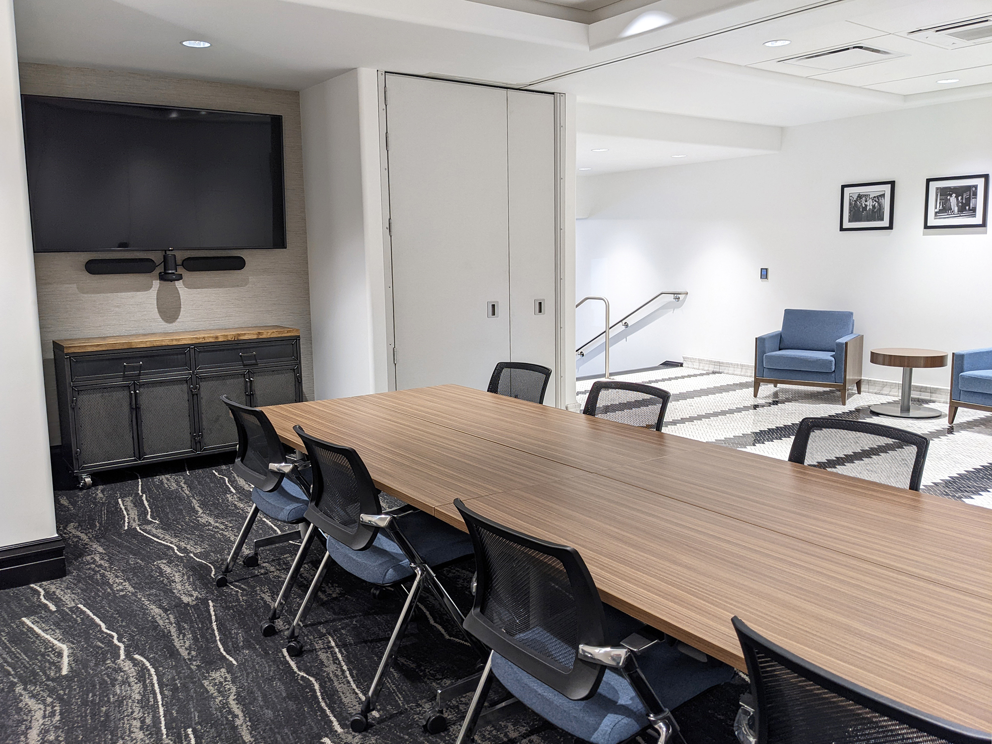 The mezzanine waiting area also received updated finishes, a glass railing, and A/V capabilities. Planning for new administrative offices on the second floor stopped at design development, but the conference center and mezzanine renovations were completed in the Spring of 2022.