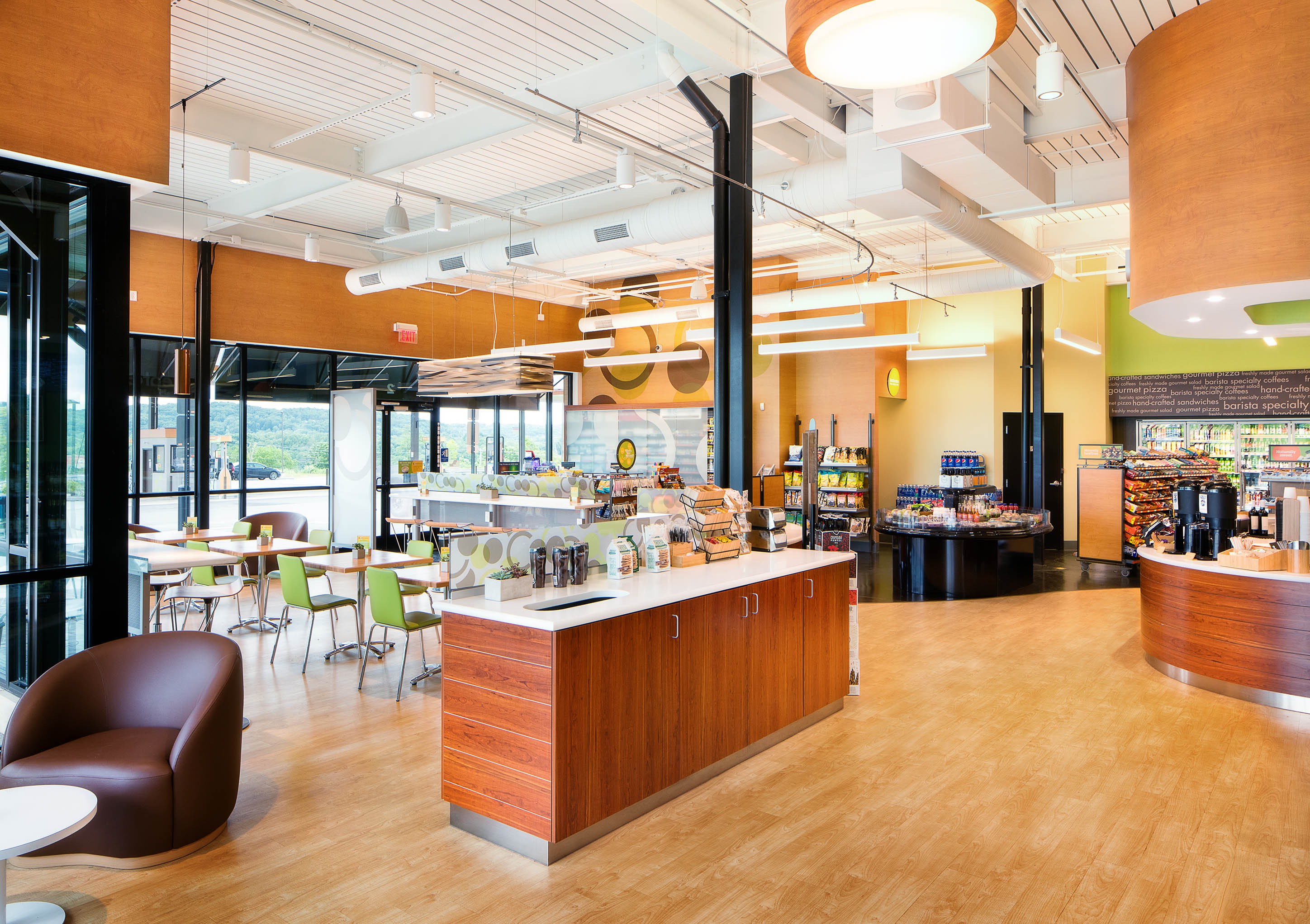 The Owner challenged the project team to design and construct a benchmark, pro-type facility that integrated and translated its brand values into a premium customer experience for convenience and fueling stores. Not just a fueling and convenience store, it was to serve as a touch point for relaxing and dining beyond the typical C-Store experience. Another challenge was the site design. Given the building is essentially viewed in the round and therefore has no back door, all sides of the building required careful design attention. The site not only had to accommodate passenger vehicles, but serve as a natural gas fueling depot for a major trucking distribution center located adjacent to the site. Therefore, the site design had to manage the competing needs of pedestrians, passenger vehicles and semi-trucks, all in a safe clear traffic management solution.