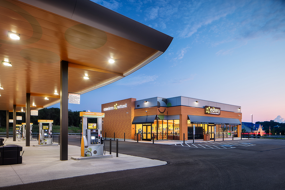 American Natural wanted to integrate and translate its brand values into a premium convenience and fueling store while prioritizing and personalizing the customer experience. The store needed to serve as a relaxing dining option beyond the typical c-store experience by providing access to cleaner, more economic fuel, and healthier food options.