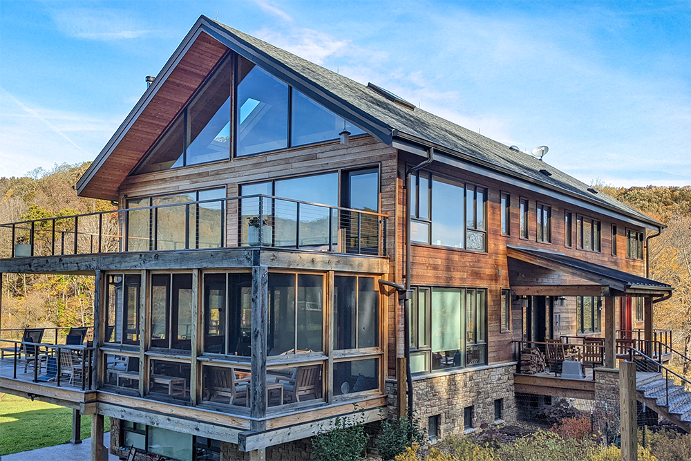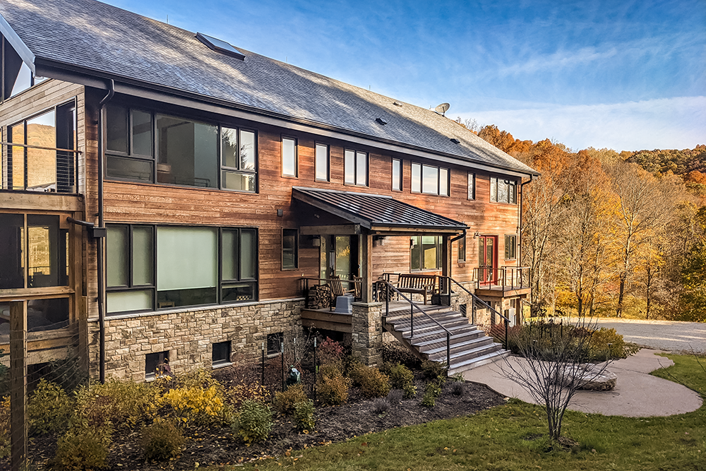 Energy consumption is supplemented by sustainable, cost-effective renewable resources, such as geothermal heating and a ground-mounted PV solar panel array. The design incorporated locally-sourced materials, including stone veneer and heavy timber. The result is a contemporary rustic lake home for the entire extended family to enjoy views of the beautiful Laurel Highlands.