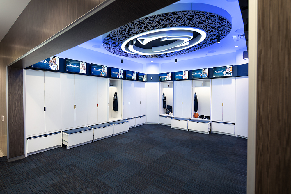 The men’s and women’s basketball suite renovations encompass the entrances, team lounge spaces, kitchenettes, team locker rooms, and wet areas. The renovations employ modern materials and a clean, neutral palette that highlight the iconic Penn State colors and branding. The goal was to create an energized environment that is truly a “home base”- a versatile place for players to work, focus, regroup, and relax. All areas are equipped with the latest technology that keeps players and coaches connected both on and off the court. This first phase of design and construction was completed in November 2020.