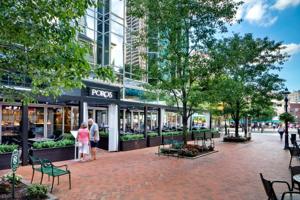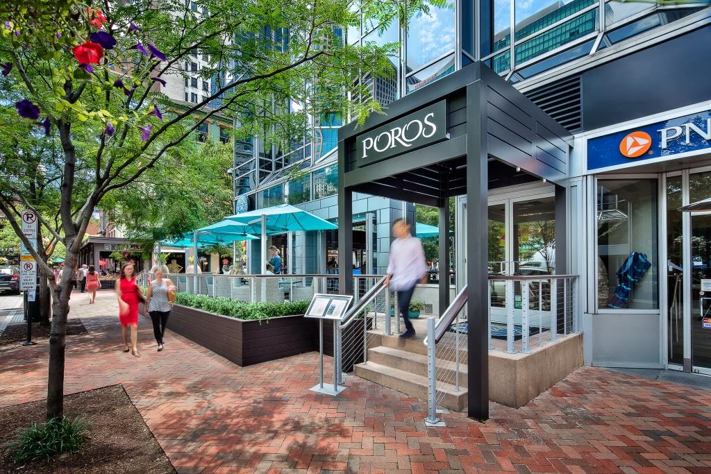 Located on the corner of the ground floor of Two PPG Place in the busy Market Square in downtown Pittsburgh, the design of the new restaurant plays a role in re-energizing a space that had long been considered a dead corner of the building. The design for POROS incorporates features that are important and expected by consumers in a high-end establishment. The most important aspect of the design is the outdoor space creating strong visual curb appeal and bringing new life to this corner retail space.